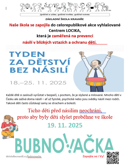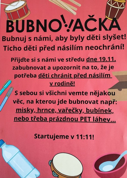 Ticho před násilím neochrání, proto aby byly děti slyšet, proběhne ve škole 19. 11. 2025 BUBNOVAČKA. Bližší informace v přiloženém letáku.