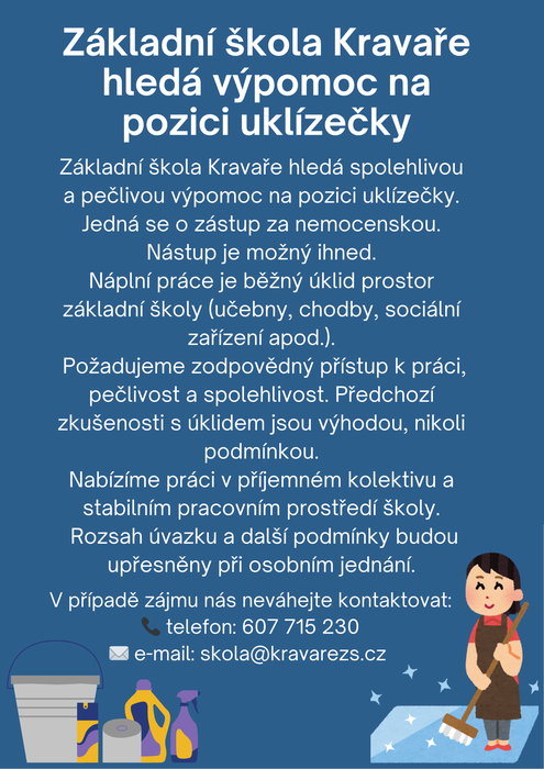 Základní škola Kravaře, příspěvková organizace hledá spolehlivou a pečlivou výpomoc na pozici uklízečky. Nástup možný ihned! Bližší informace v přiloženém plakátu.